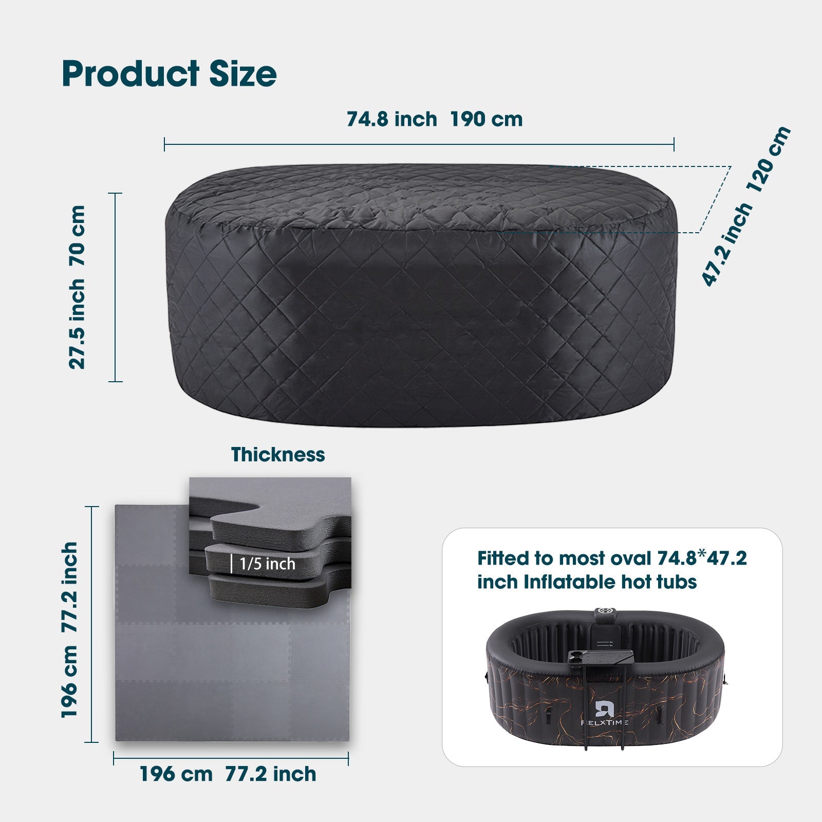 SIZE: Our oval thermal cover can be securely fitted to most oval Inflatable hot tubs, measured at 74.8"L x 47.2"W x 27.5"H. Our thickened mat measured at 77.2"L x 77.2"W x 0.2"H. Suitable for most RELXTIME hot tubs.
